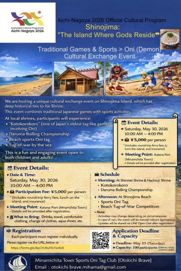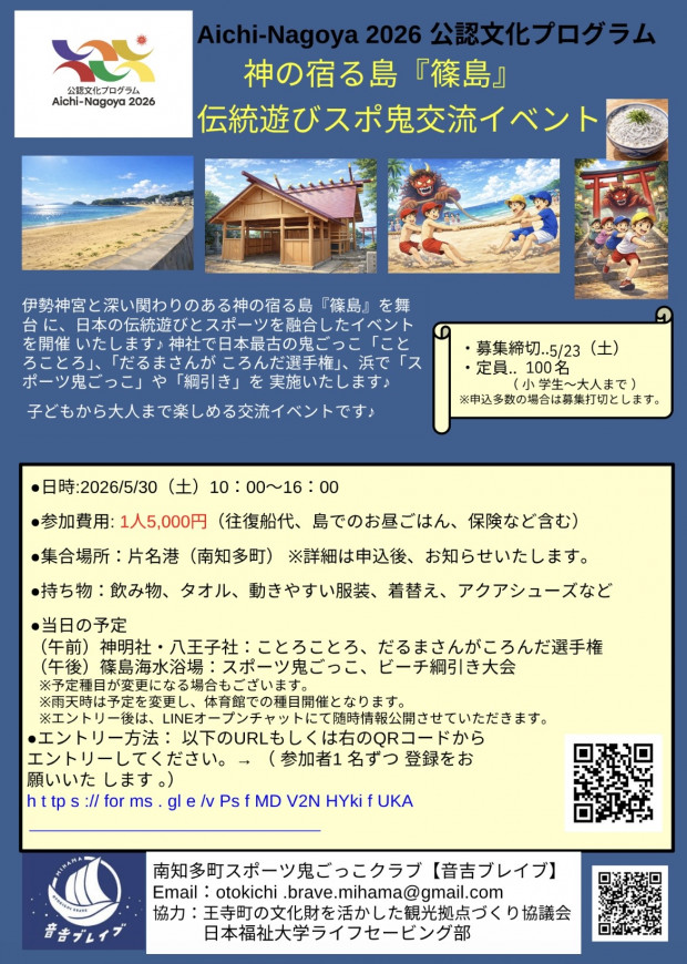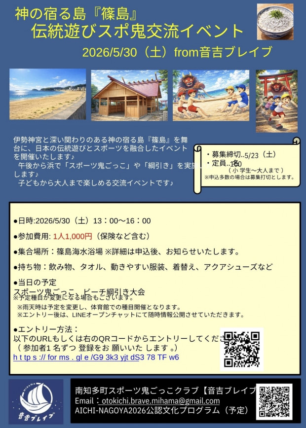 南知多町スポーツ鬼ごっこクラブ『音吉ブレイブ』による交流イベント by staff • 2026年04月18日掲載 令和8年5月30日(土) 南知多町スポーツ鬼ごっこクラブ『音吉ブレイブ』による交流イベントが篠島で開催されます。 1枚目:一般参加の方用 2枚目:篠島の子供たち用 3枚目:海外の方用 エントリー及び、お問い合わせは下記まで mailto:otokichi.brave.mihama@gmail.com 一般参加の方用 篠島の子供用 海外の方用