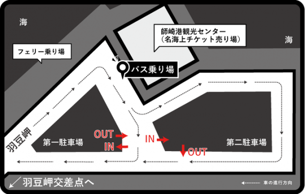 師崎港臨時駐車場が開設されます。期間中は、臨時駐車場⇔師崎港間のシャトルバスが運行されます。師崎港観光センター駐車場が満車の際は、臨時駐車場をご利用いただけます。